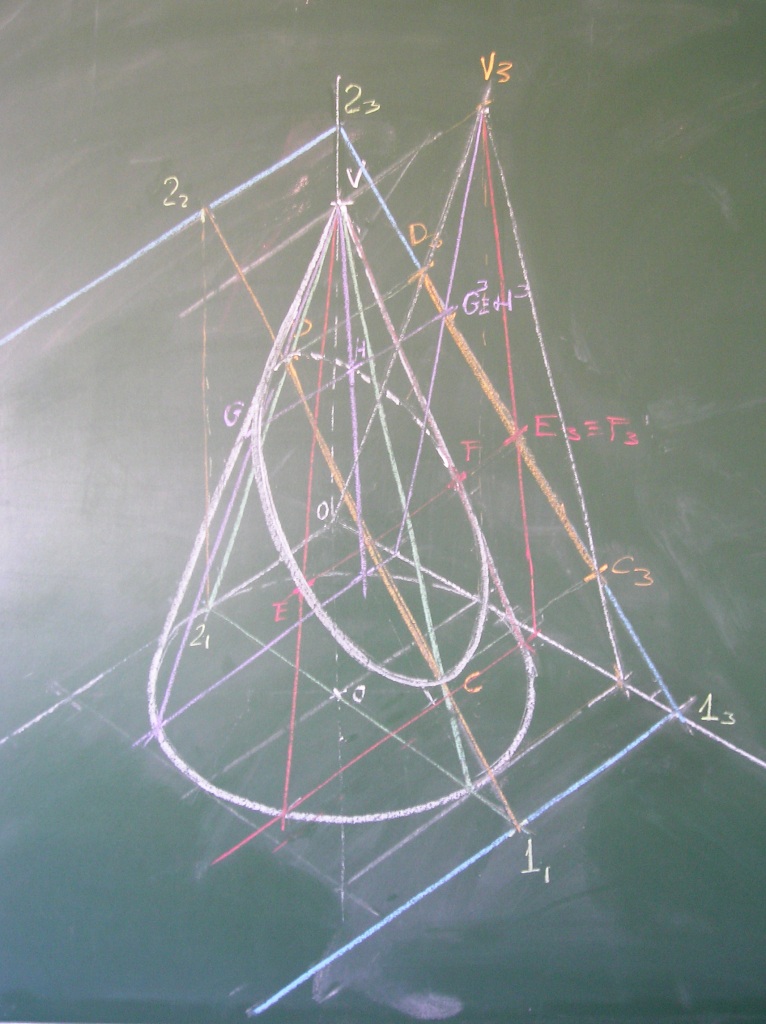 Dibujamos las bisectrices de ABC, que coinciden con las alturas de ABC. Trazamos por Ha, Hb y Hc perpendiculares a tales bisectrices, que son los lados del triángulo buscado, ABC. Esta es la primera solución. Señalamos el ortocentro O \ y la circunferencia de Feuerbach.